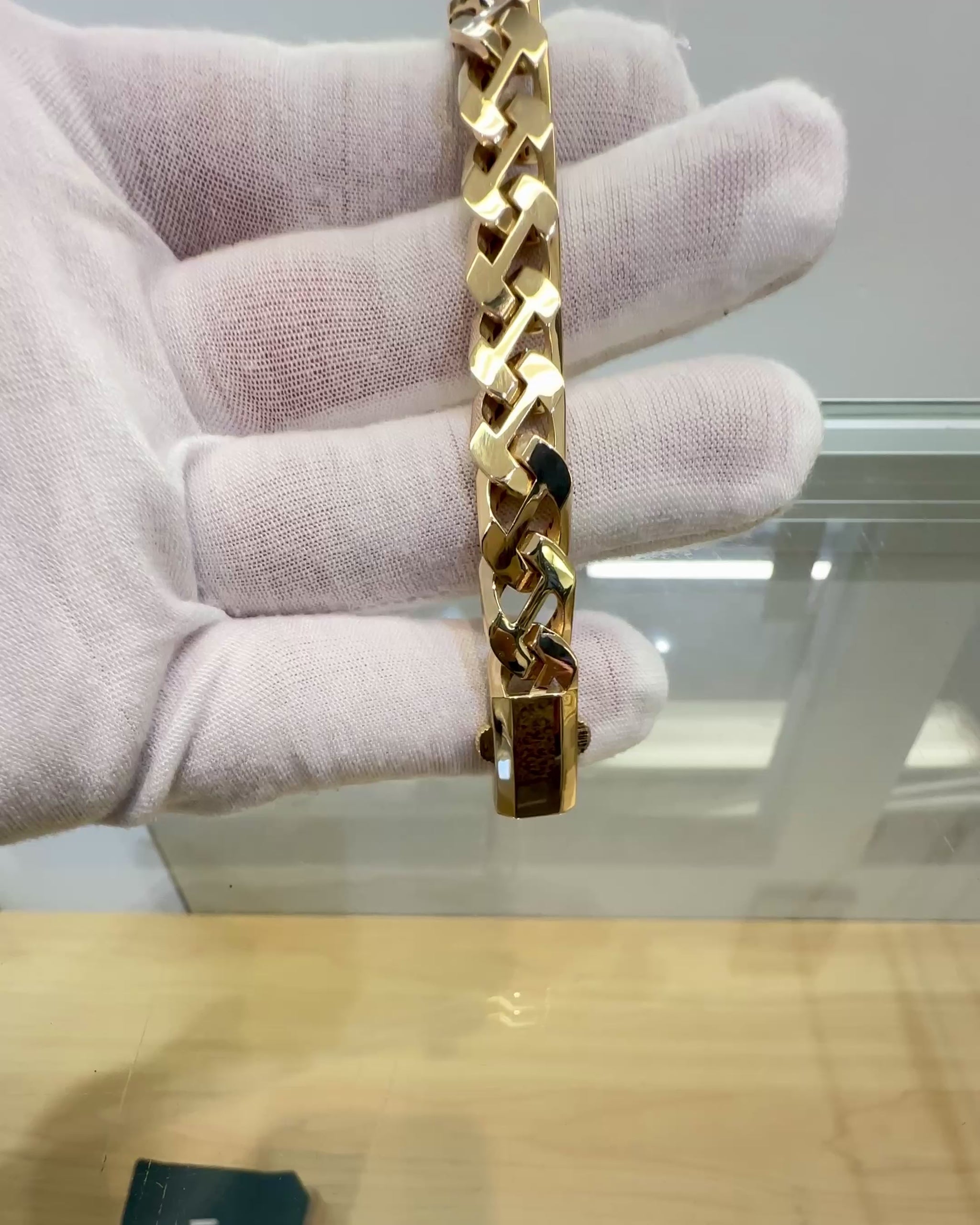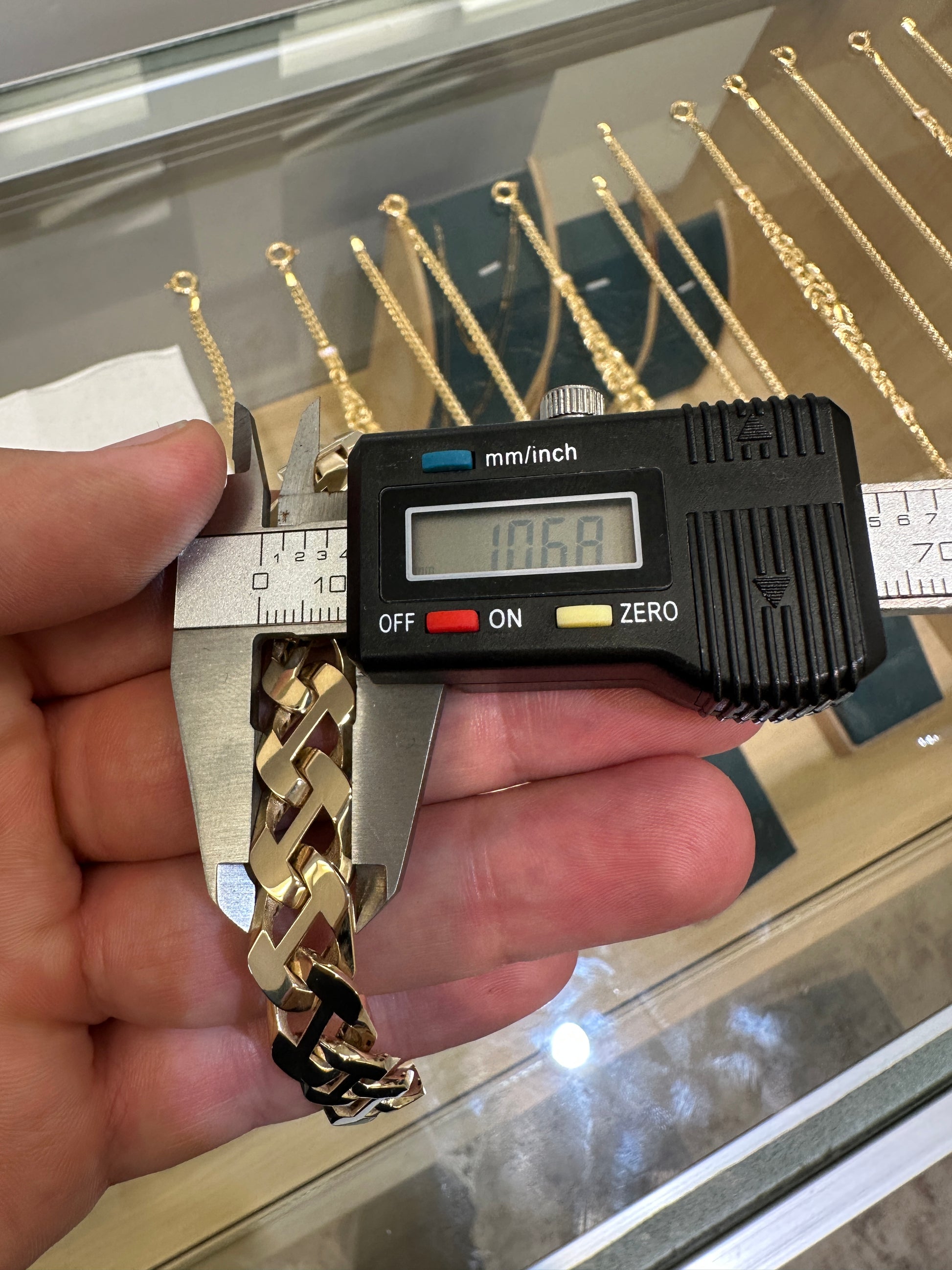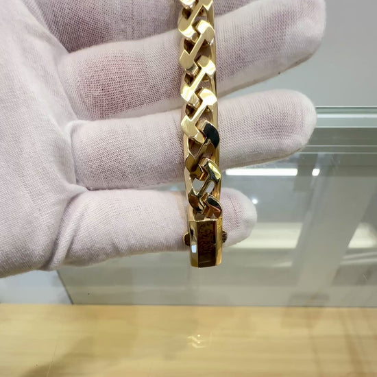 A substantial 14K real gold bracelet with a bold 11 mm profile and a mechanical double safety box clasp for a secure, premium finish. Built in-house for smooth drape and mirror polish.