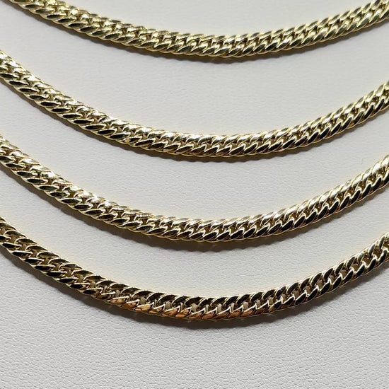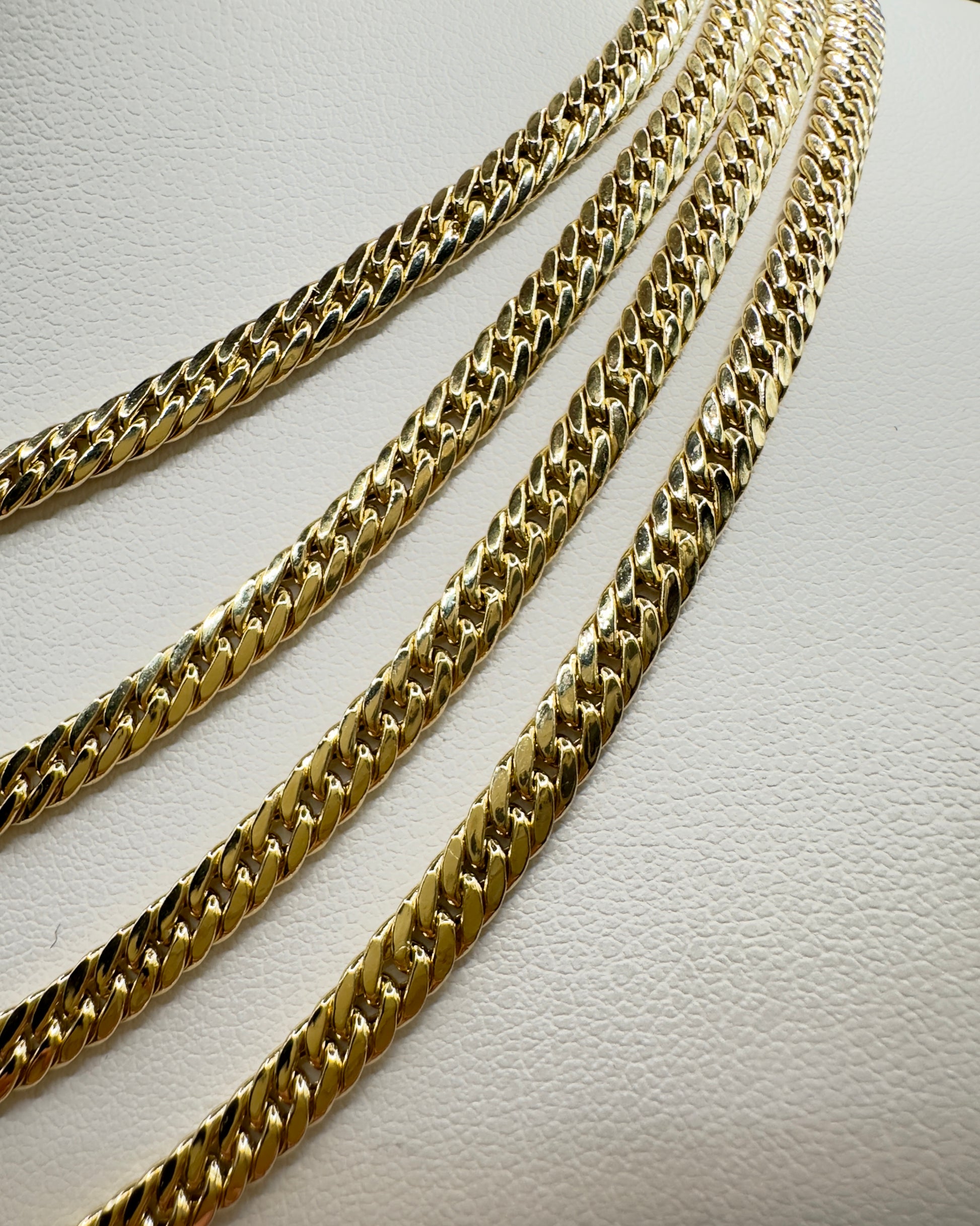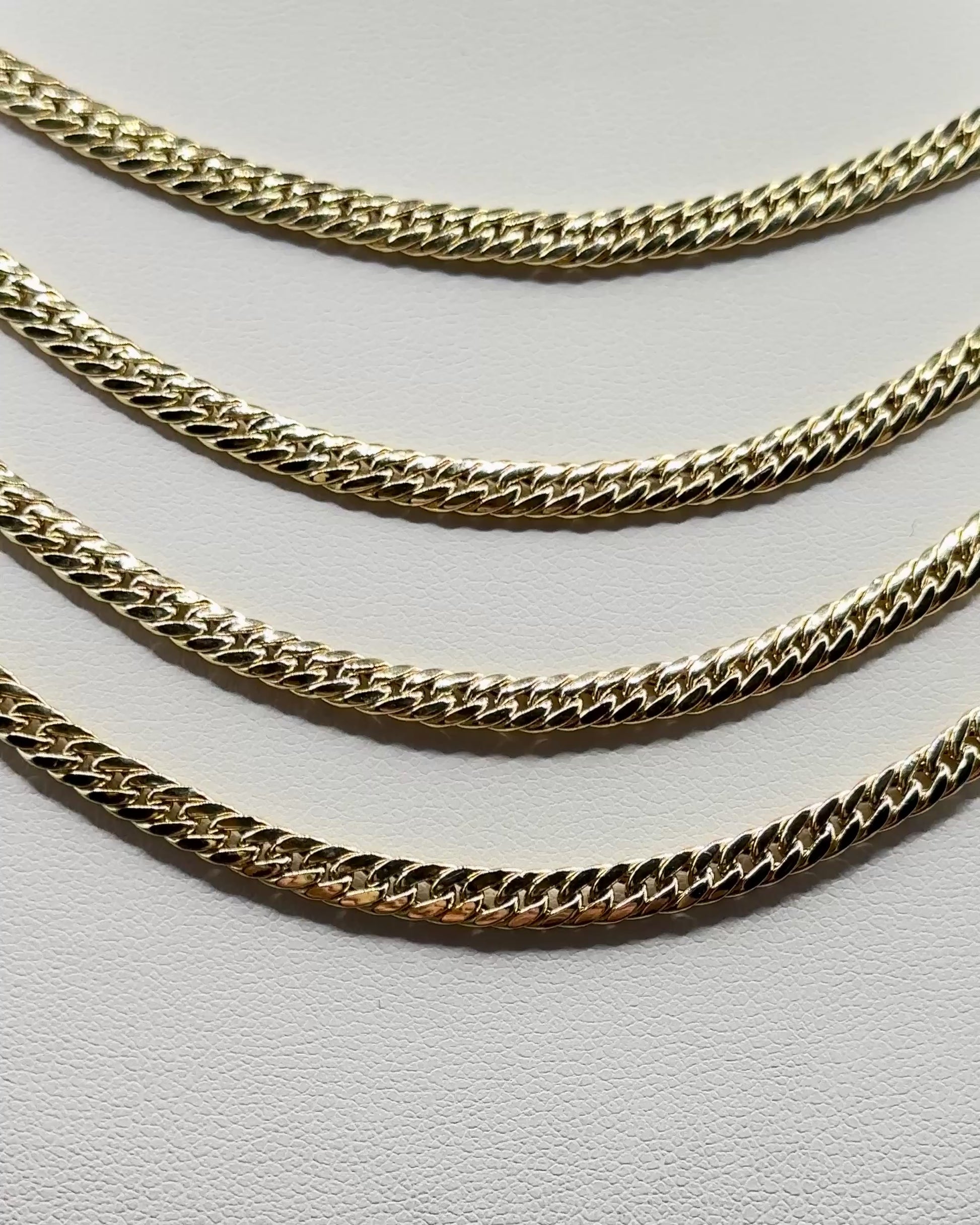 A sleek compact Cuban—also known as a tight Miami—in 14K real gold. 22 inches long with a clean 4 mm profile for bright, close-set shine and a smooth, flat drape.