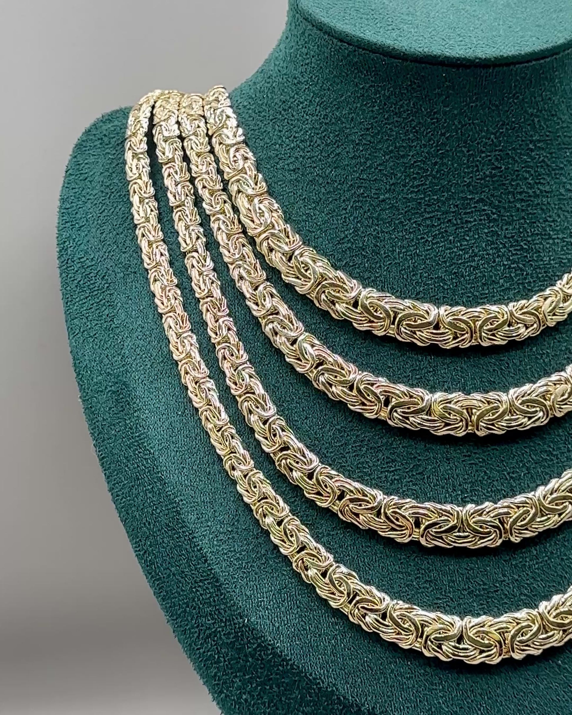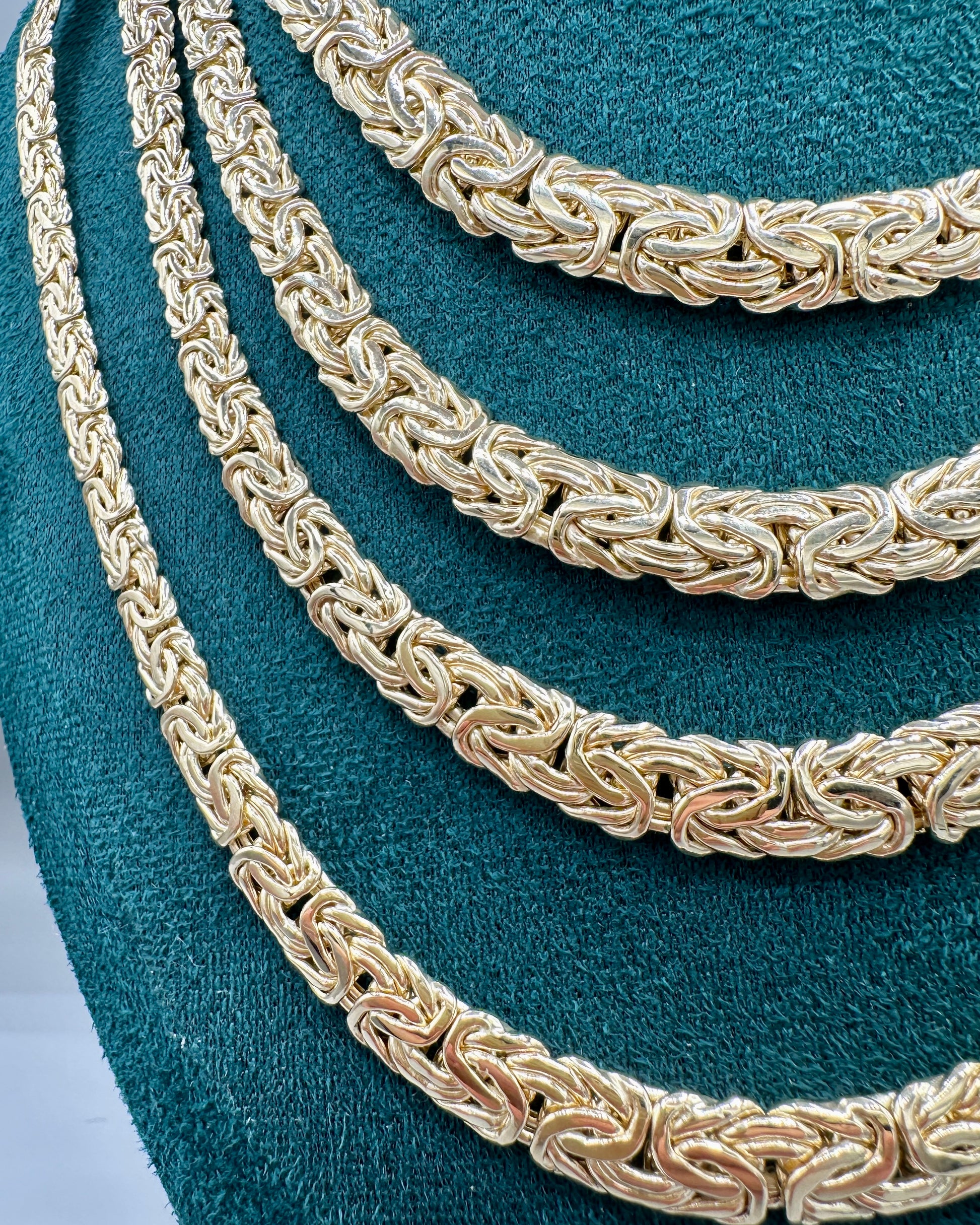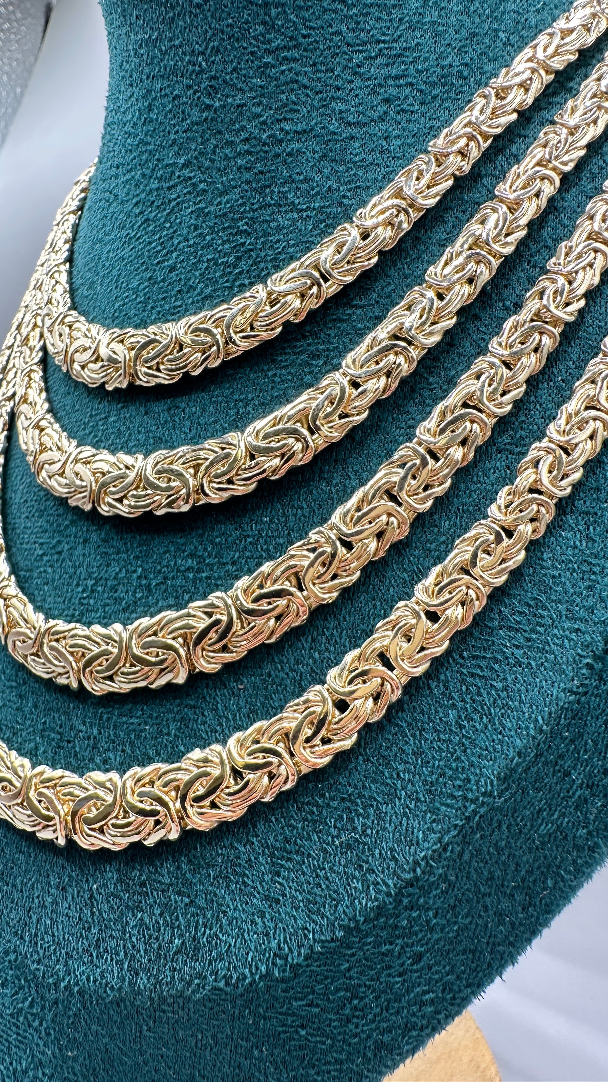 A refined tapered/graduate Byzantine link set that narrows at the clasp and opens through the center for a powerful yet comfortable drape—4 mm ends → 6 mm mid → 9 mm center. Hand-finished in 14K real gold for balanced shine.